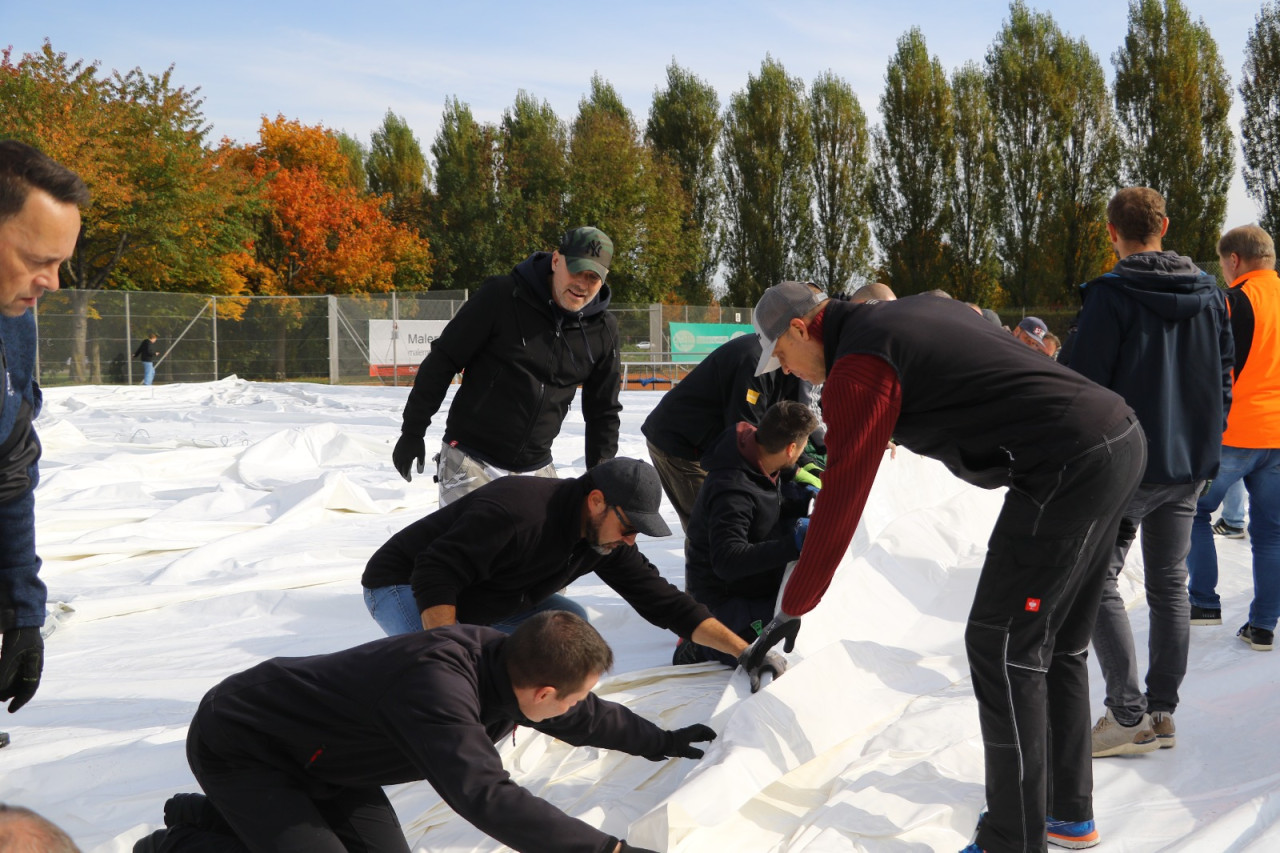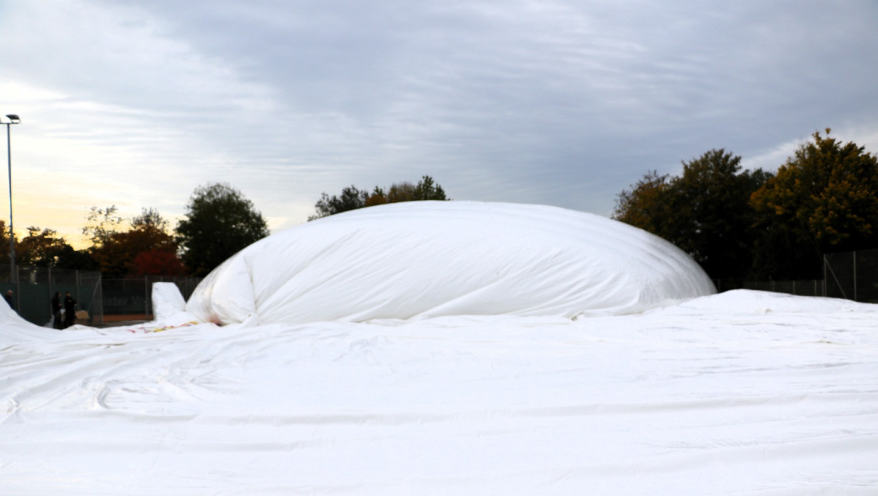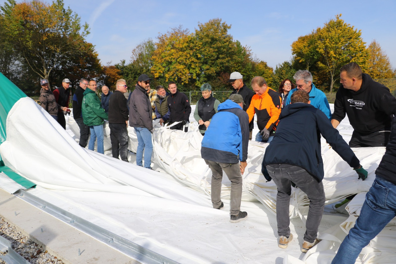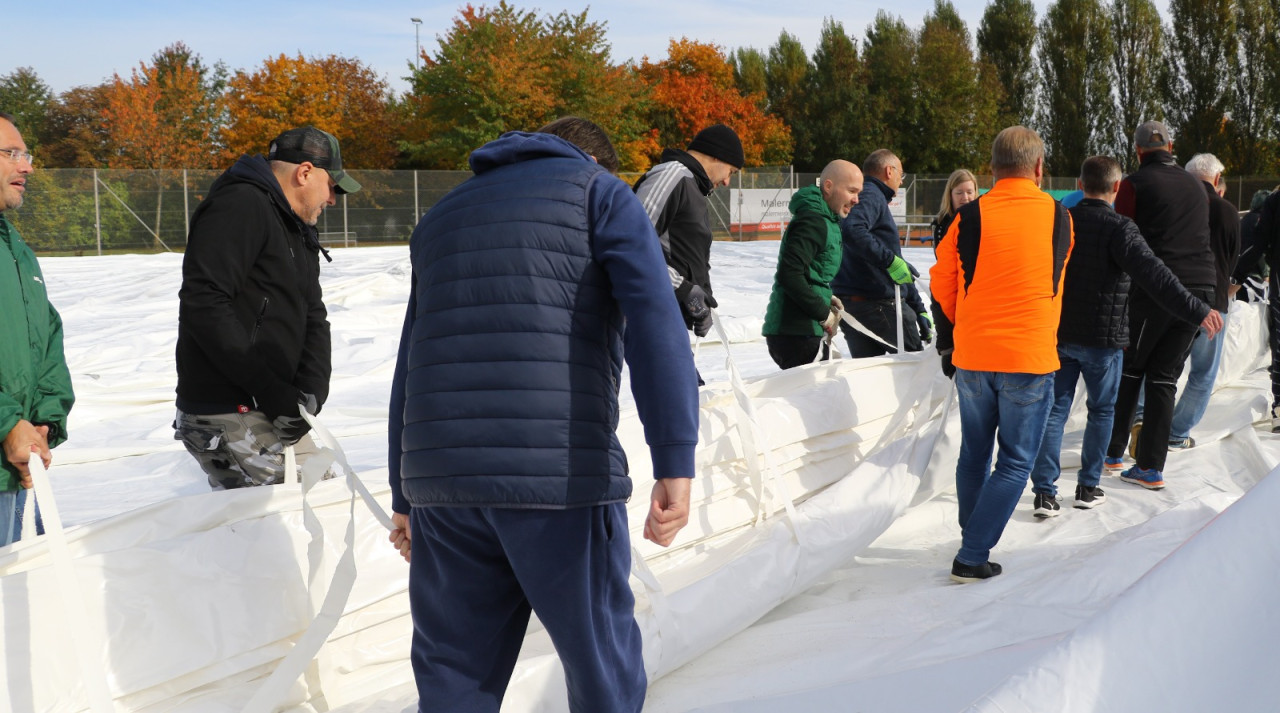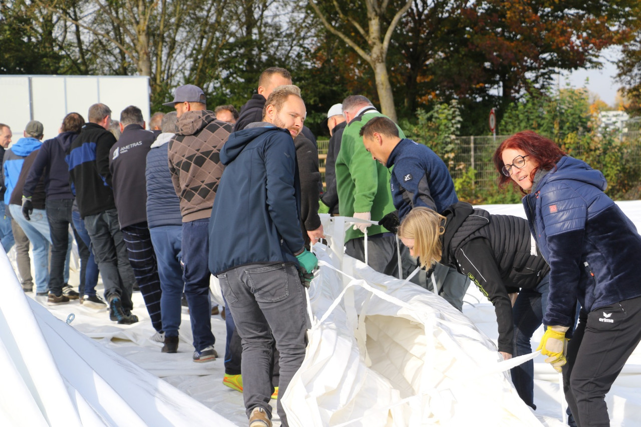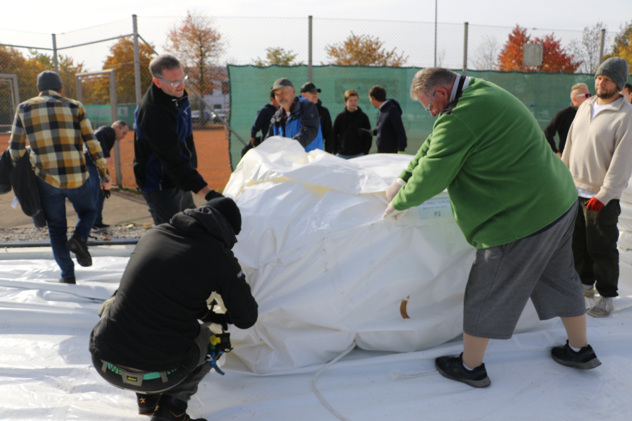 Ein lang gehegter Wunsch der Tennisabteilung geht mit großen Schritten seiner Erfüllung entgegen. Schon 2015 hatte man auf einer Abteilungsversammlung erklärt, dass die Tennisspieler eine Tennishalle benötigen, denn die alte Tennishalle ( Eder) war zu diesem Zeitpunkt renovierungsbedürftig, aber in Ermangelung anderer Winterspielstätten fand man sich bei der Tennisabteilung weiter hin mit der Nutzung dieser ab. In den folgenden Jahren verschlechterte sich der Zustand der Halle weiter, bis man auf eine Anmietung dieser verzichtete. In den letzten Jahren wurden Alternativen geprüft, andere Tennishallen während der Wintersaison genutzt und der Bau einer neuen Tennishalle in Erwägung gezogen. Abteilungsleiterin Jana Daniel und Diana Kreppold investierten viel Zeit in zahlreiche Termine und Präsentationen bei Gemeinde, Verband, Vorstand und Investoren. Sie und zahlreiche andere Helfer konnten nun am Sonntag, 19.10. erleben, wie ihre Vision von einer Tennishalle zum Leben erweckt wurde, als nach kürzester Bauzeit, der Spatenstich fand am 3.Juni 2025 statt, die Hülle der Traglufthalle aufgepumpt wurde.