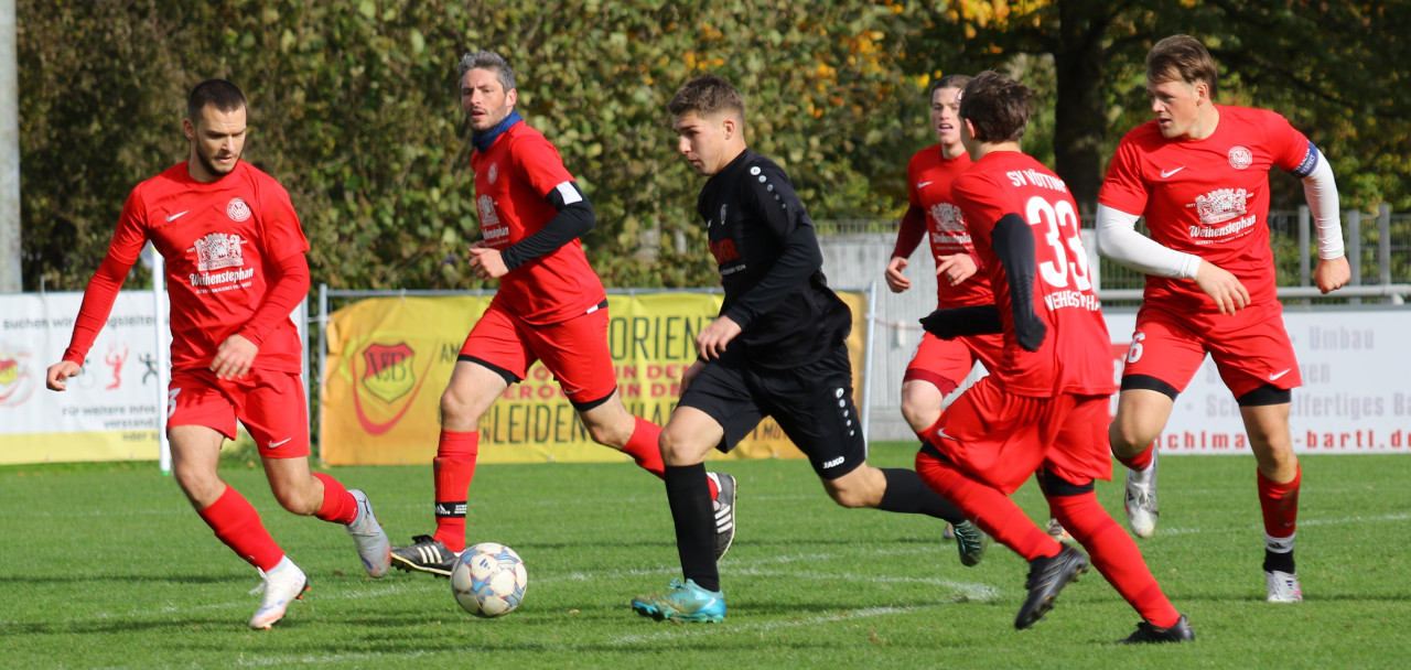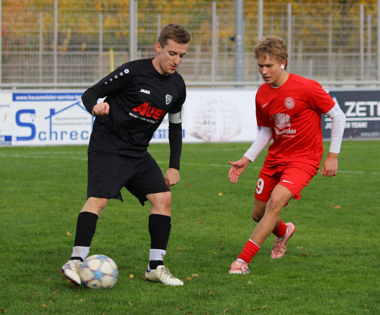 Vor etwa 100 Zuschauern begann die Partie bei windigem, aber schönem Herbstwetter. Die Gastgeber konnten sich zunächst leichte Vorteile erarbeiten und gewannen im Verlauf der ersten Halbzeit immer mehr Spielanteile. In der 27. Minute fiel das erste Tor des Spiels: Mannschaftskapitän Michael Angermair mit der Rückennummer 27 reagierte am schnellsten, nachdem Co-Trainer Joshua Balden aus über 20 Metern Entfernung einen sehenswerten Fernschuss an die Latte gesetzt hatte. Der Ball prallte in den Fünfmeterraum ab, wo Angermair einlief und den Ball per Kopf über die Linie drückte. Mit dieser 1:0 Führung ging es in die Halbzeitpause.