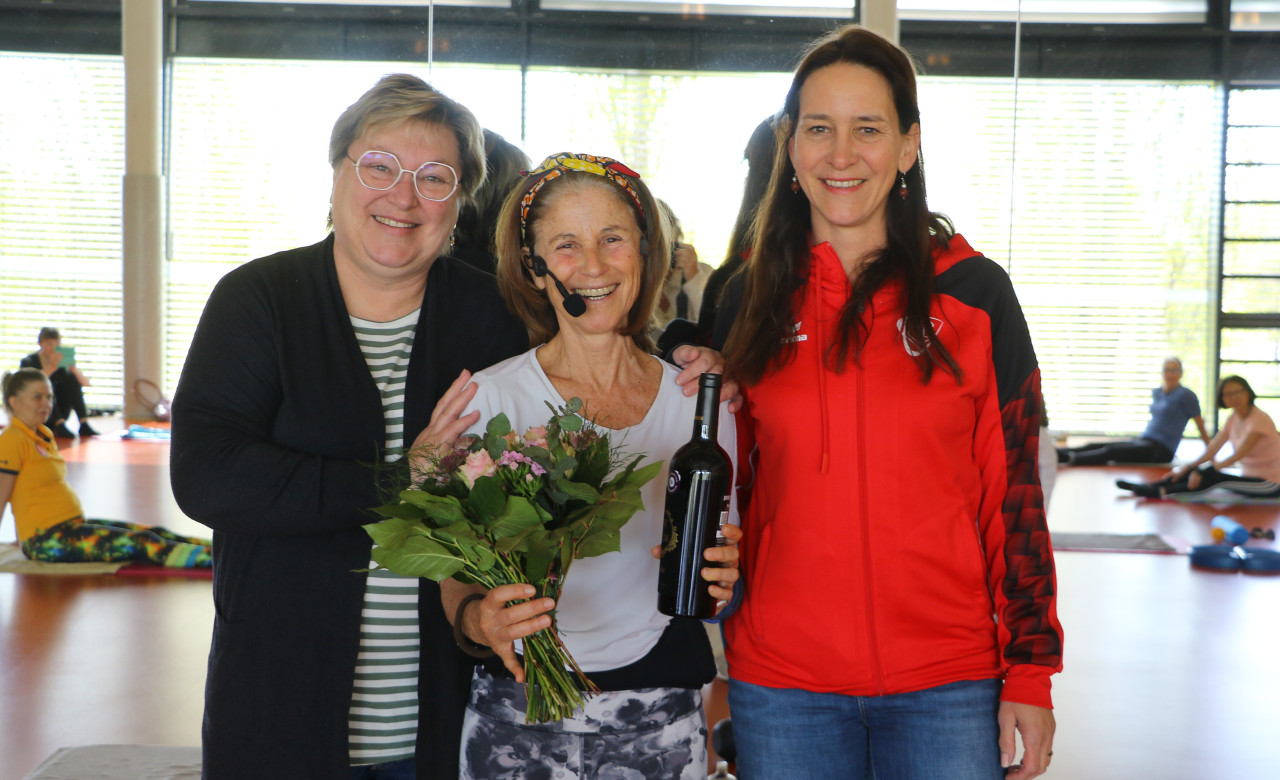 Damit hatte Cristina Garcia de Jentys nicht gerechnet . Am Donnerstagmorgen gab es einen überraschenden Besuch: Jeannine Dressel , die 1.Leiterin der Fitness & Dance Abteilung des VfB's erschien gemeinsam mit Michaela Reitmeyer, 3. Vorstand im Pilates – Kurs um der engagierten Trainerin zu gratulieren. Mittlerweile schon 25 Jahre ist die temperamentvolle Argentinierin als Fitnesstrainerin im Fitness-Forum aktiv und versprüht nicht nur gute Laune, sondern mit Leidenschaft und Spaß bekommt sie alle in Bewegung. Ob Kurse wie Fitness / Fatburner / Stretching / Latin Party / Pilates / Yoga, die Teilnehmer genießen ihre Stunden und freuen sich über Schweißperlen. Als kleines Danke schön für soviel Engagement gab es einen Blumenstrauß und einen guten Tropfen. Der VfB freut sich jemanden wie Cristina in den eigenen Reihen zu haben und hofft auf viele weiter Jahre Fitness mit Cristina.