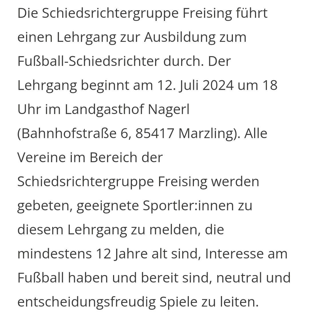 Wer gerne Schiedsrichter werden möchte bekommt ab 12.Juli die Möglichkeit einen Schiedsrichter -Lehrgang zu machen. dieser startet am 12. Juli um 18.00 Uhr im Landgsthof Nagerl in Marzling. Weitere Infos und Anmeldung gibt es unter