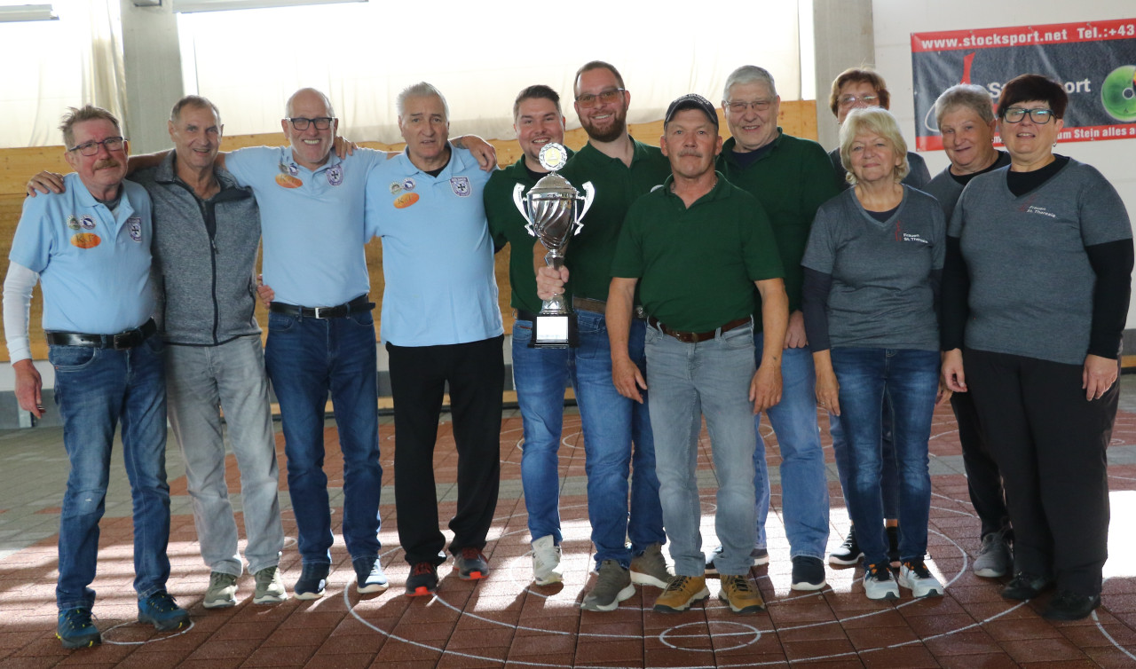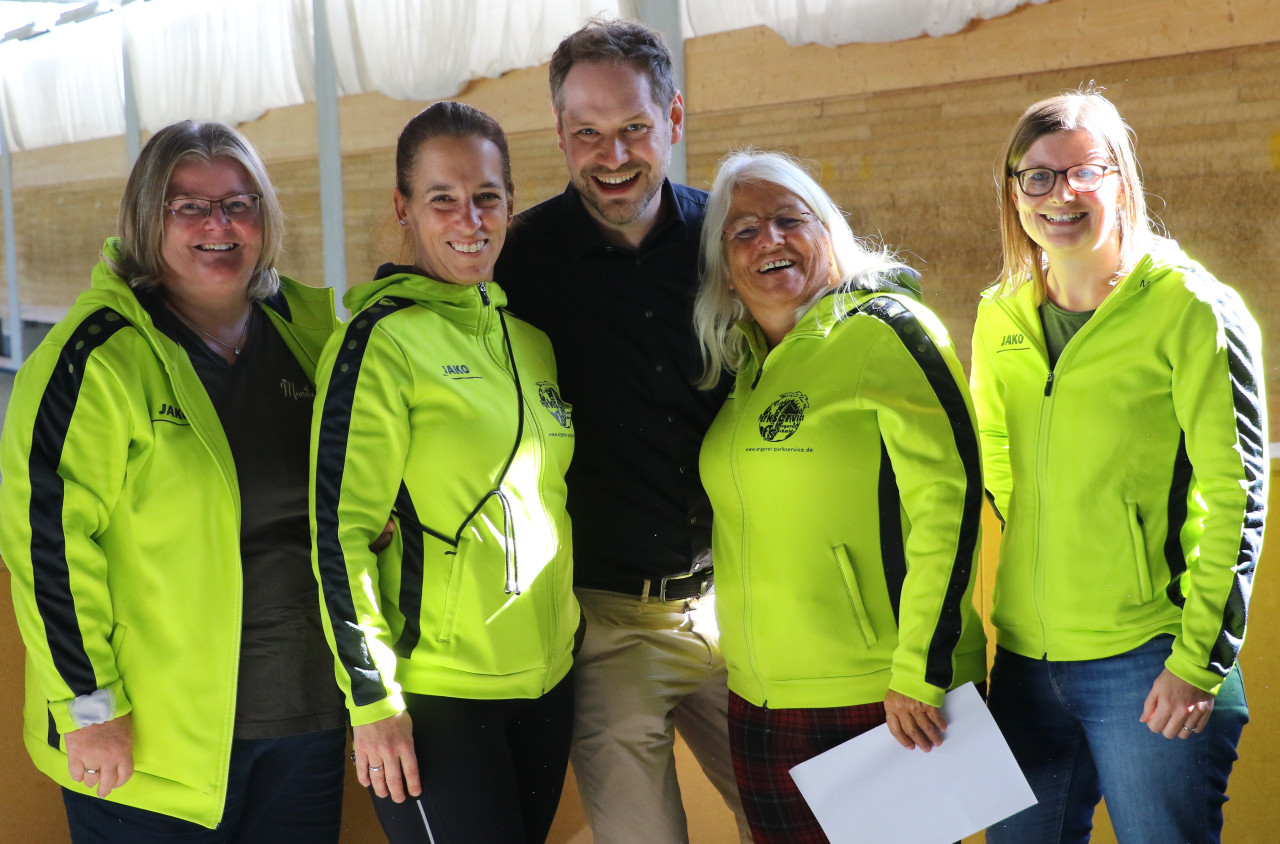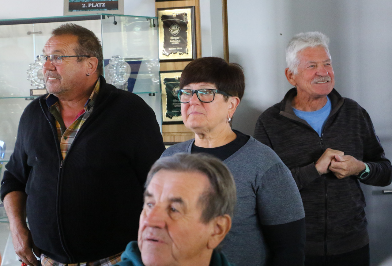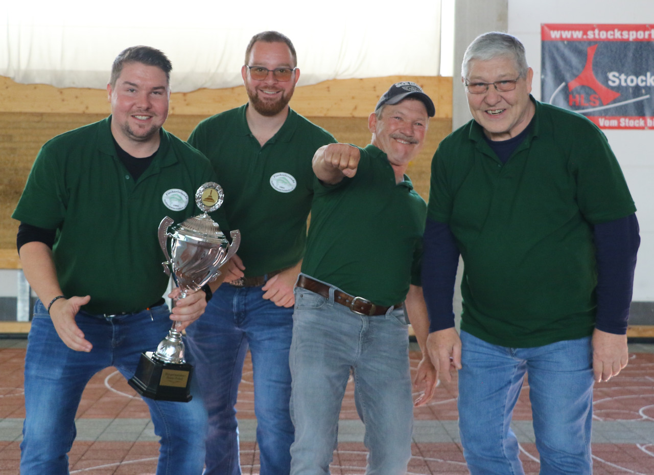Groß war die Freude bei den Fischerfreunden. Nach jahrelanger Zeit des Wartens hatten sie es endlich wieder mal geschafft, ganz oben auf den Treppchen zu stehen. Immer gehörten sie zum Favoritenkreis doch andere schnappten sich den Pokal. Heuer waren nur 9 Mannschaften am Start und so mancher erinnerte sich mit Wehmut noch an die Zeiten als man morgens und mittags startete, weil sich so viele Teams gemeldet hatten. Deshalb drückte auch Abteilungsleiterin Angelika Neumair ihre Hoffnung aus, dass sich in den nächsten Jahren wieder mehr 4er Gruppen anmelden. Jede Mannschaft ist willkommen, ob Betriebsmannschaften, Sportlergruppen, Freundeskreise, einfach mal mitmachen, es macht Spaß und gibt Fleisch-und Wurstpreise oder schöne Gemüse-Kisten. Bürgermeister Henn, der heuer zum ersten Mal die Ehre hatte „seinen" Pokal zu überreichen zeigte sich gut gelaunt und hatte sichtlich Spaß und Freude bei der Preisverleihung . Nach den Fischerfreunden gratulierte er den Vertretern des Krieger- und Soldatenvereins auf Platz 2, gefolgt von den Frauen St. Theresia. Vierter wurde die SG Edelweiß, auf Rang 5 landeten die Feuerwehrleute der FFW Hallbergmoos, gefolgt vom Hausler Hof Team. Den Platz 7 belegte die FFW Goldach und punktgleich nur durch die Stocknote getrennt, landete die farbenfrohe Narrhalla vor dem Team CSU.