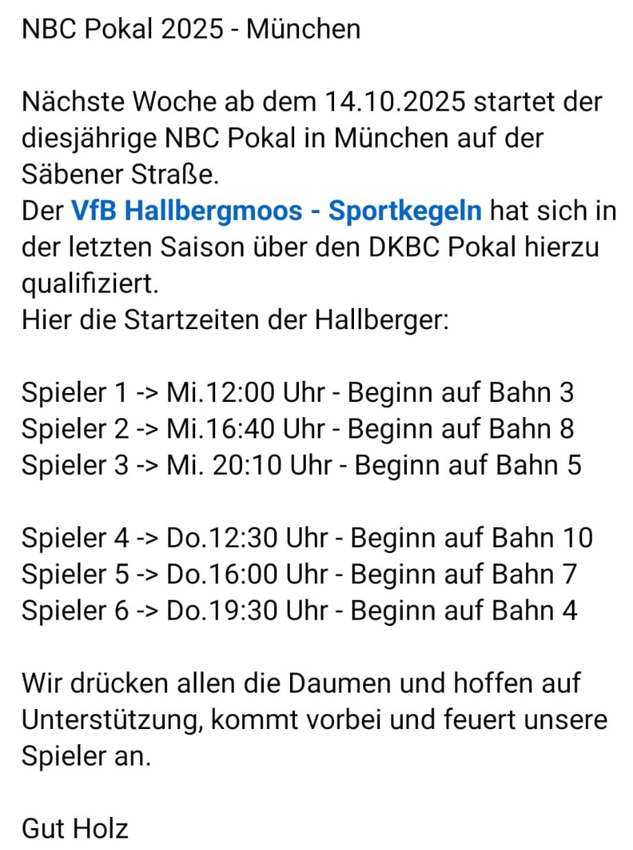 Dank eines 3. Platzes beim DKBC -Pokal(ähnlich dem DFB-Pokal bei den Fußballern, konnte sich das Bundesliga-Team des VfB Hallbergmoos für den internationalen NBC-Cup qualifizieren. Dieser wird vom 14- 18.10 in München ausgetragen. Unser Team würde sich über Unterstützung freuen. Spielzeiten siehe unten, bitte durch scrollen.