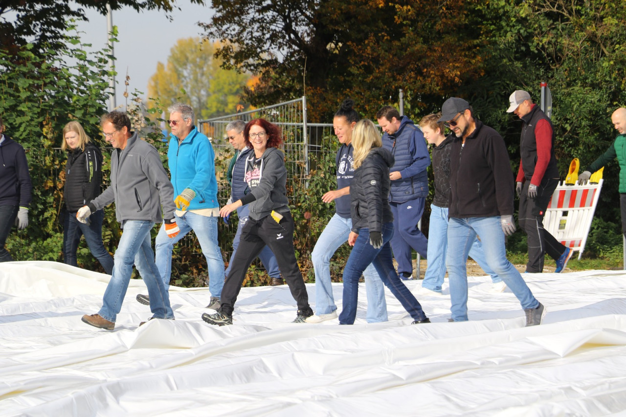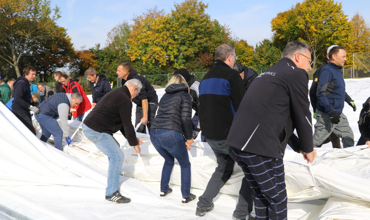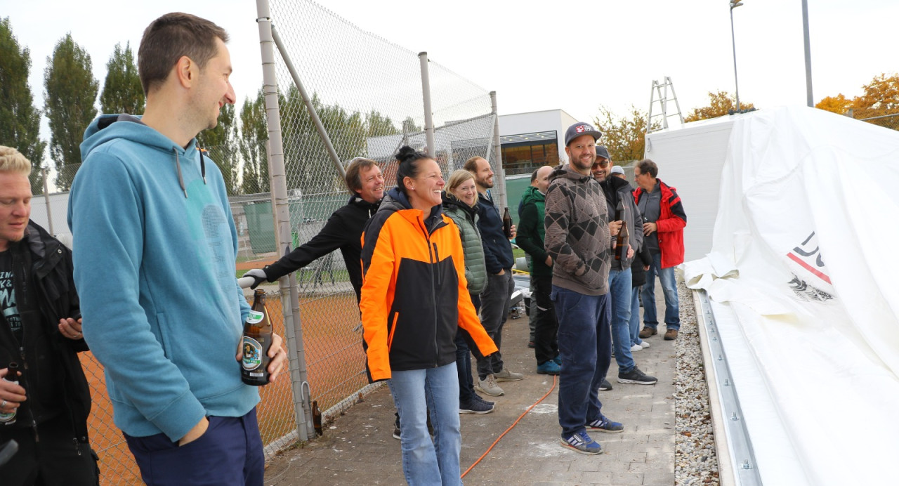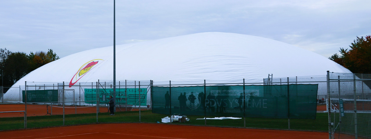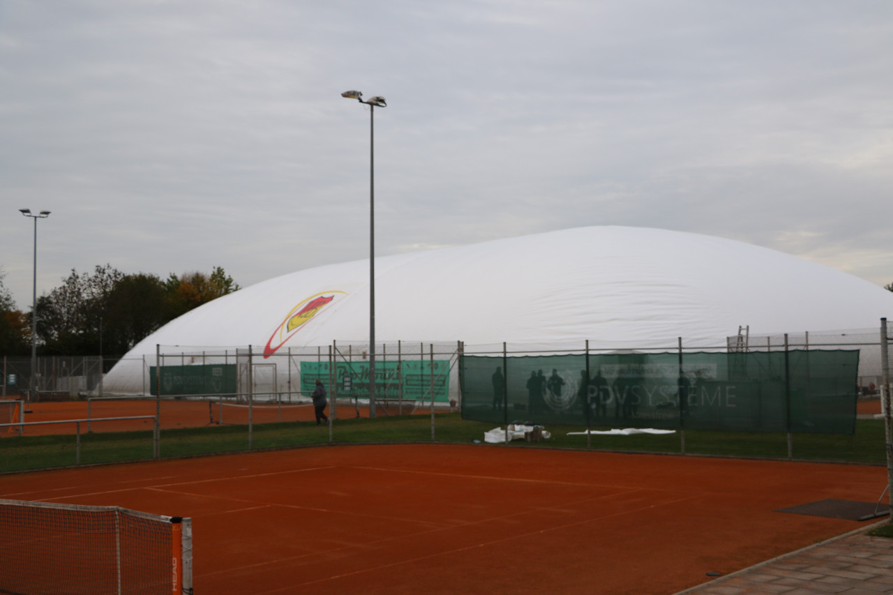 Ein lang gehegter Wunsch der Tennisabteilung geht mit großen Schritten seiner Erfüllung entgegen. Schon 2015 hatte man auf einer Abteilungsversammlung erklärt, dass die Tennisspieler eine Tennishalle benötigen, denn die alte Tennishalle ( Eder) war zu diesem Zeitpunkt renovierungsbedürftig, aber in Ermangelung anderer Winterspielstätten fand man sich bei der Tennisabteilung weiter hin mit der Nutzung dieser ab. In den folgenden Jahren verschlechterte sich der Zustand der Halle weiter, bis man auf eine Anmietung dieser verzichtete. In den letzten Jahren wurden Alternativen geprüft, andere Tennishallen während der Wintersaison genutzt und der Bau einer neuen Tennishalle in Erwägung gezogen. Abteilungsleiterin Jana Daniel und Diana Kreppold investierten viel Zeit in zahlreiche Termine und Präsentationen bei Gemeinde, Verband, Vorstand und Investoren. Sie und zahlreiche andere Helfer konnten nun am Sonntag, 19.10. erleben, wie ihre Vision von einer Tennishalle zum Leben erweckt wurde, als nach kürzester Bauzeit, der Spatenstich fand am 3.Juni 2025 statt, die Hülle der Traglufthalle aufgepumpt wurde.