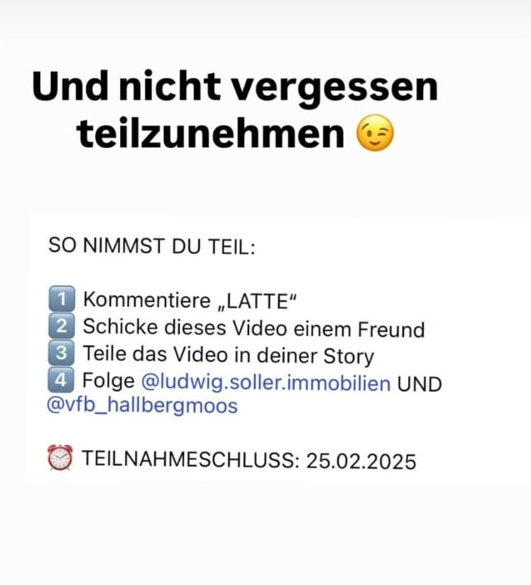 3 x voll auf die Latte schießen und die Chance haben 3000,- Euro zu gewinnen .So kann man teilnehmen; Auf Instagramm "LATTE" kommentieren , das video einem Freund schicken , das Video in deiner Story teilen und @ludwig.soller .immobilien