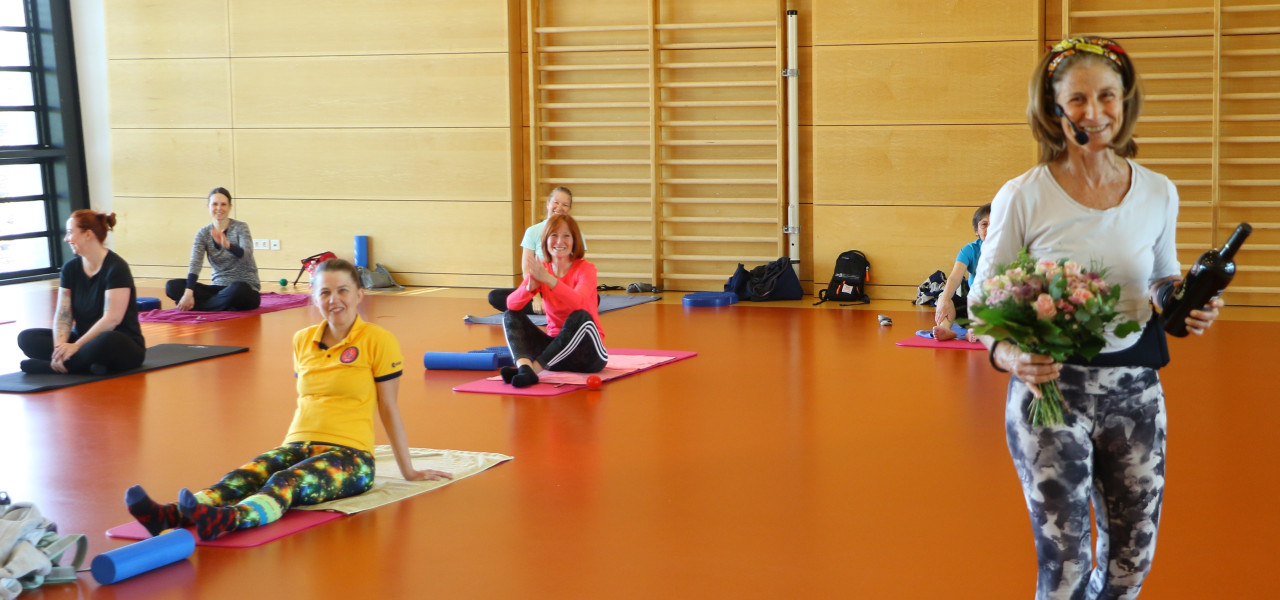 Damit hatte Cristina Garcia de Jentys nicht gerechnet . Am Donnerstagmorgen gab es einen überraschenden Besuch: Jeannine Dressel , die 1.Leiterin der Fitness & Dance Abteilung des VfB's erschien gemeinsam mit Michaela Reitmeyer, 3. Vorstand im Pilates – Kurs um der engagierten Trainerin zu gratulieren. Mittlerweile schon 25 Jahre ist die temperamentvolle Argentinierin als Fitnesstrainerin im Fitness-Forum aktiv und versprüht nicht nur gute Laune, sondern mit Leidenschaft und Spaß bekommt sie alle in Bewegung. Ob Kurse wie Fitness / Fatburner / Stretching / Latin Party / Pilates / Yoga, die Teilnehmer genießen ihre Stunden und freuen sich über Schweißperlen. Als kleines Danke schön für soviel Engagement gab es einen Blumenstrauß und einen guten Tropfen. Der VfB freut sich jemanden wie Cristina in den eigenen Reihen zu haben und hofft auf viele weiter Jahre Fitness mit Cristina.